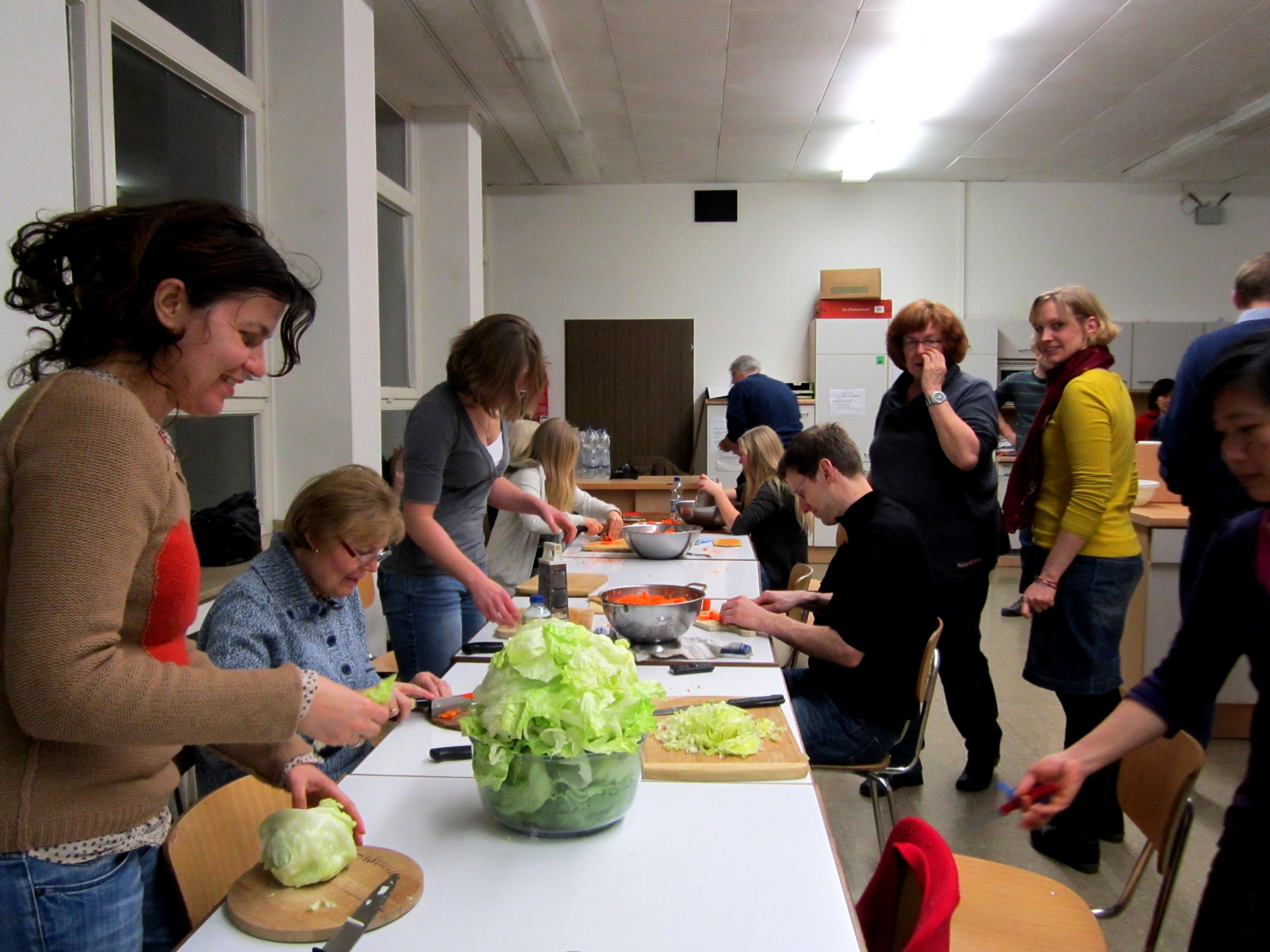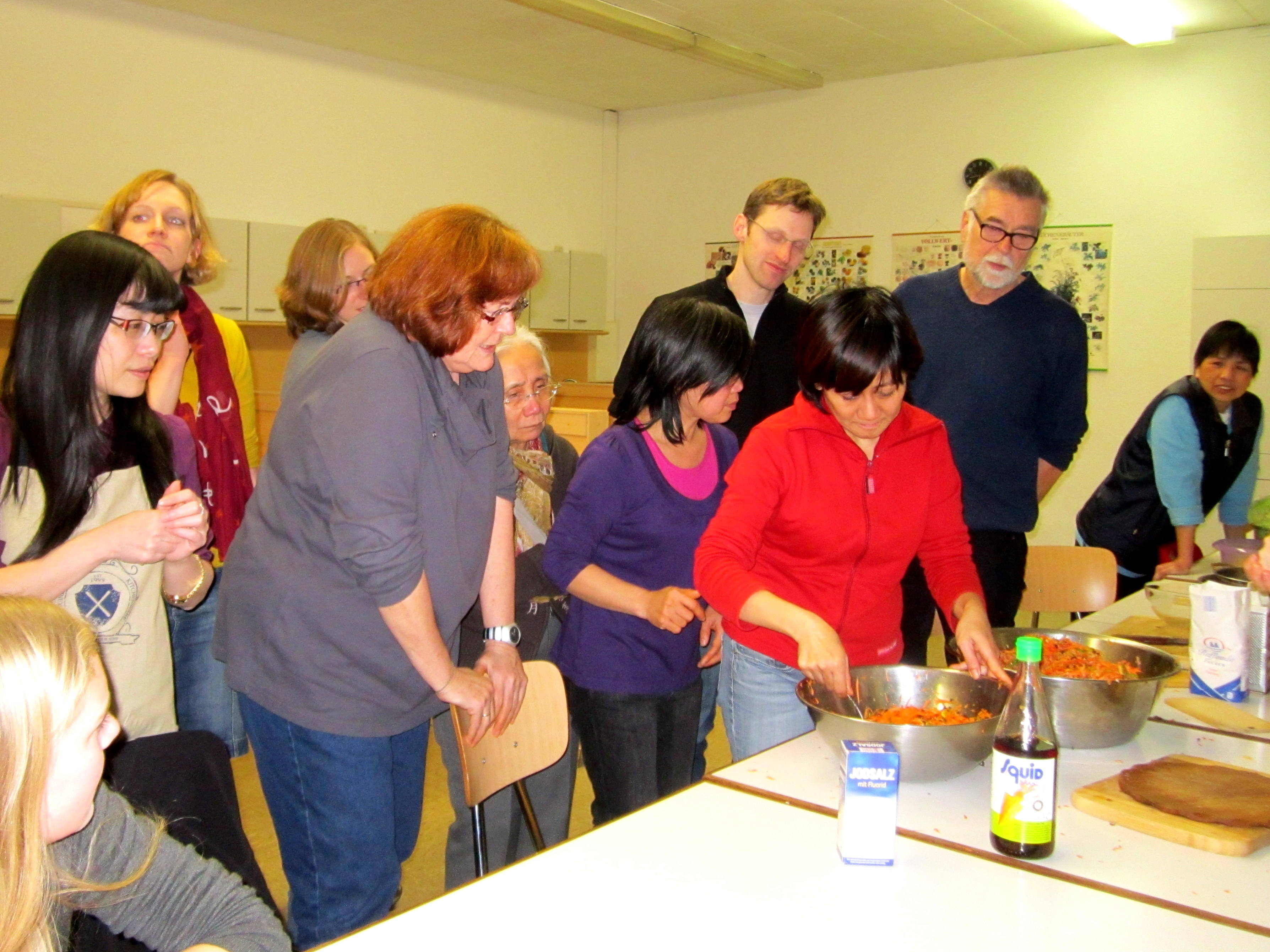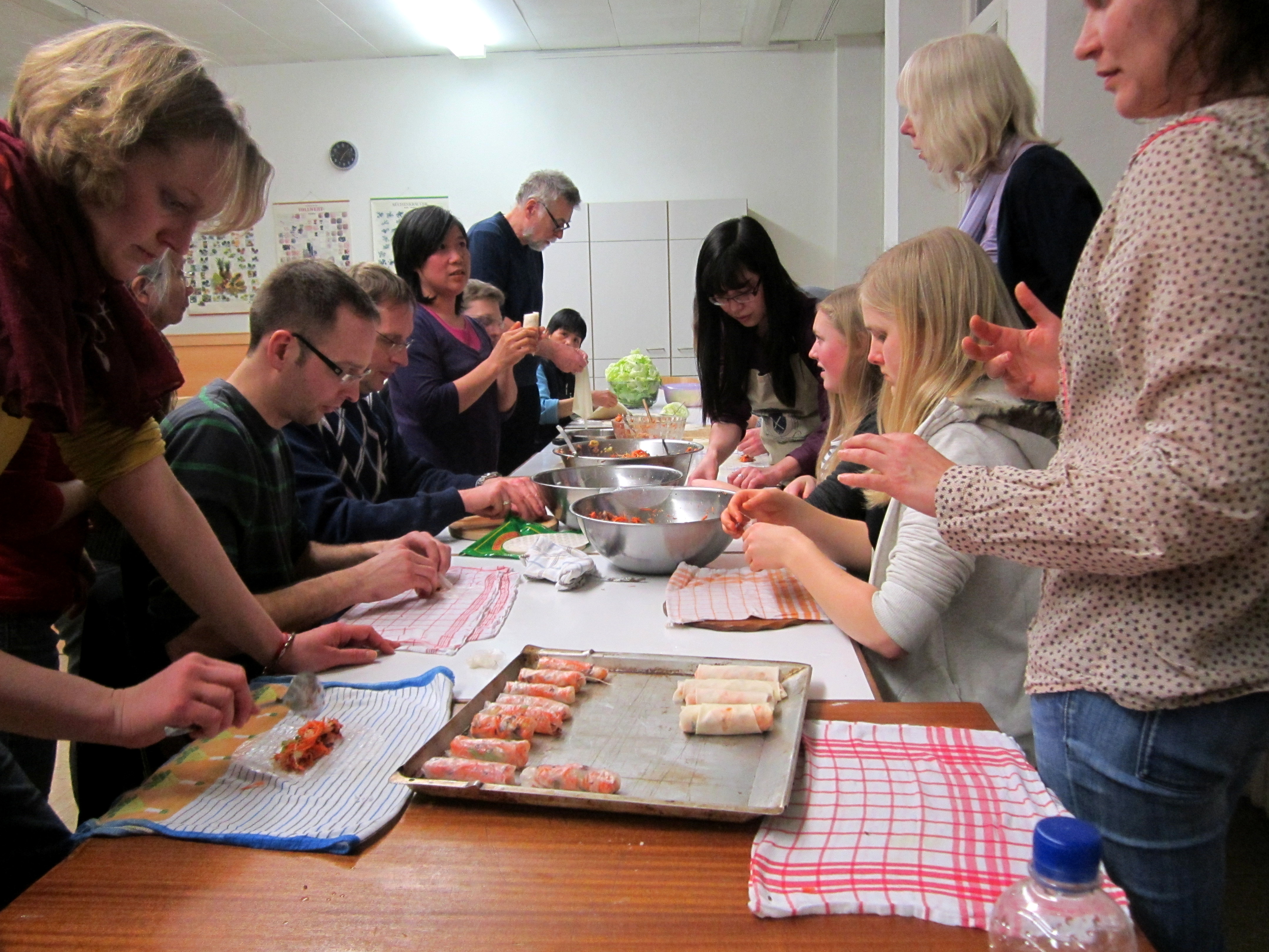 Erst am Montagabend kam die große Anmeldungswelle und der Kurs war im Nu überbucht. Absagen fiel uns auch schwer, so musste Ni – die Kursleiterin – beim Kochkurs wirklich hart arbeiten. Zum Glück konnten einige Teilnehmer Ni beim Schneiden der Gemüse oder beim Einrollen bzw. Frittieren der Frühlingsrollen helfen.