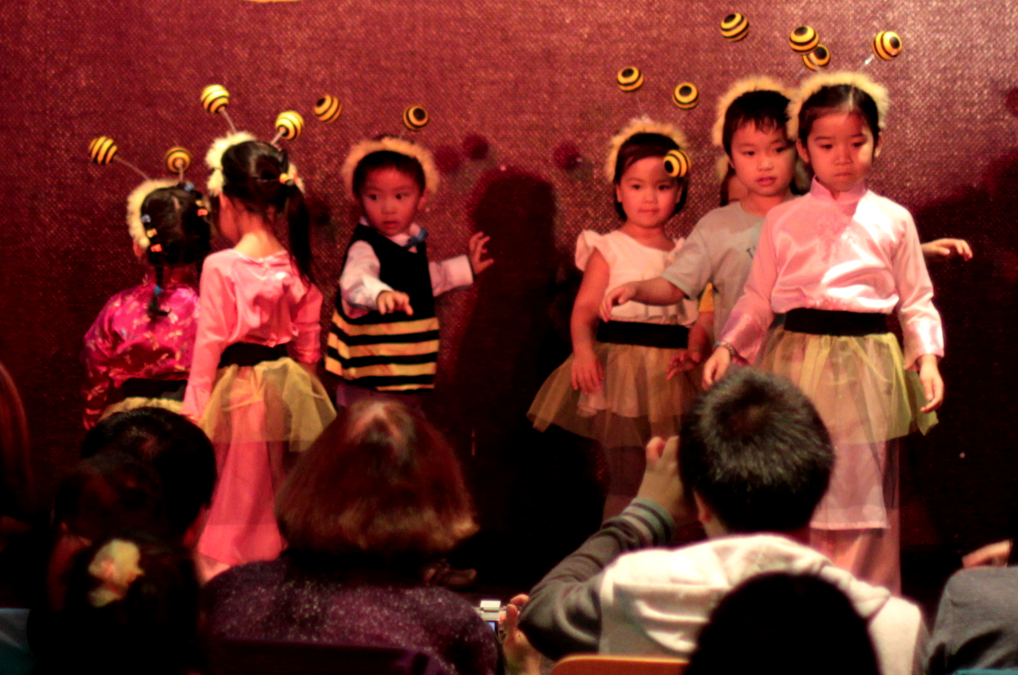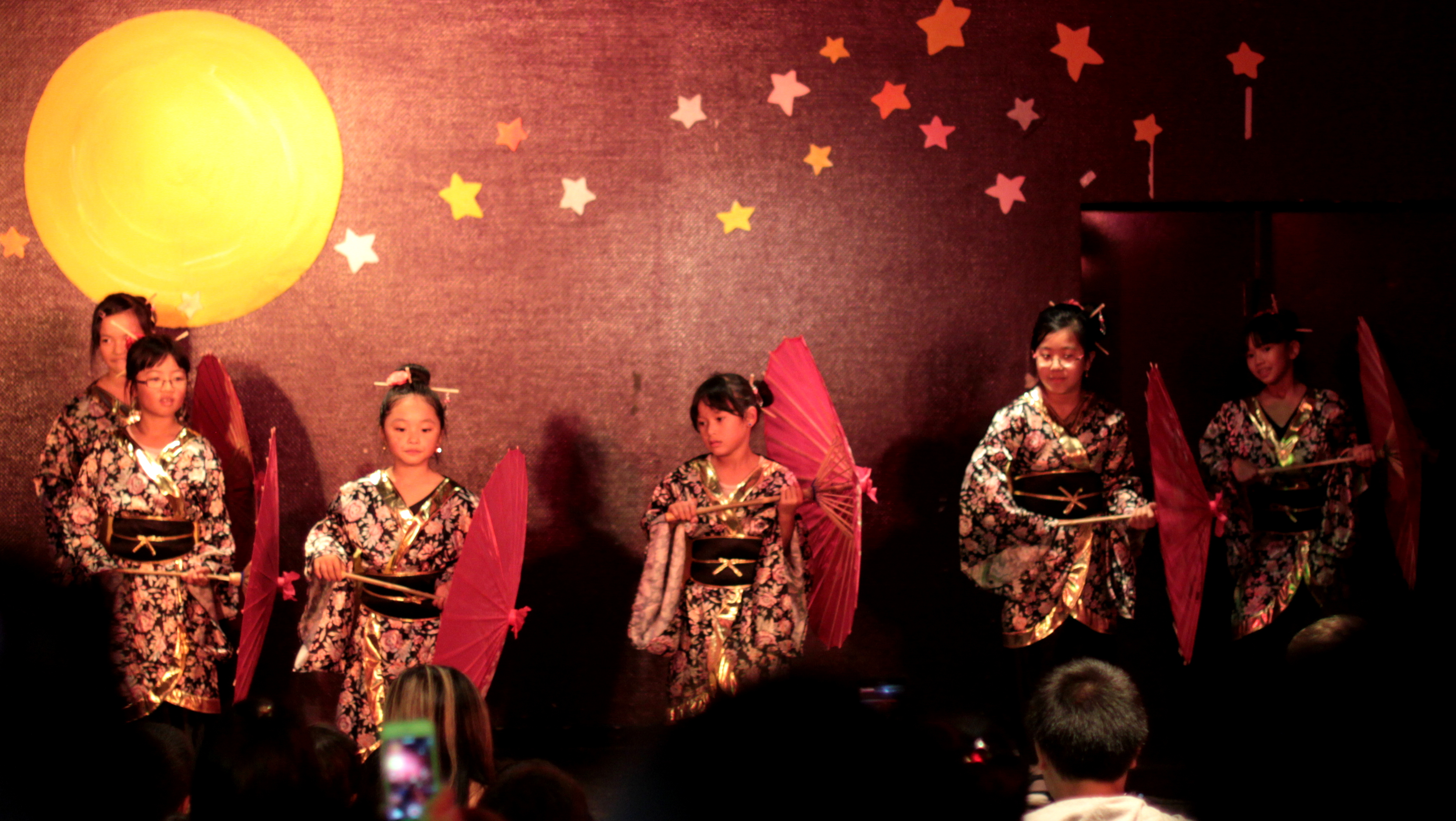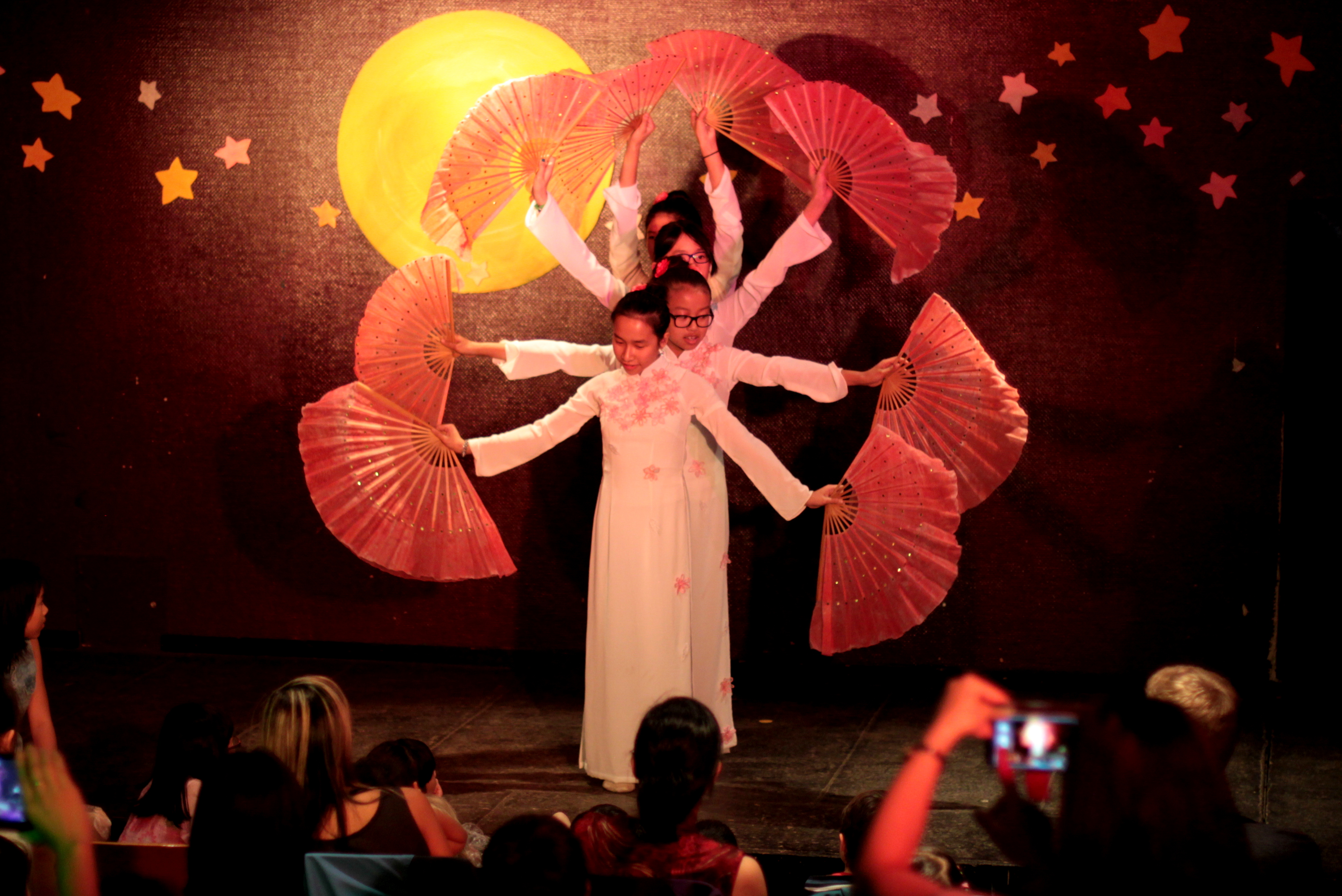 Pünktlich um 19 Uhr fing das von den Schülern und Schülerinnen unserer Sprachschule selbst organisierte kulturelle Bühnenprogramm an – die ganz Kleinen als Bienen verkleidet, die acht- bis elfjährigen Kinder als Geisha in Kimono, und die ganz Großen in traditionellen vietnamesischen „Áo dài“.