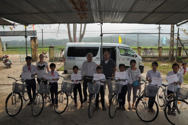 Nach der herzlichen Begrüßung wurden die Fahrräder in den Schulhof abgeladen. Plötzlich schrie ein Kind laut „2 haben keine Räder!“. Ganz vorsichtig fingen wir an, die Vorderräder zu montieren, mit Hilfe des tüchtigen und flinken Schülers Phượng, auch ein hilfsbedürftiges Kind, das von DVF Unterstützung erhielt. Die Grundschule aus Duy Thu gehören zum Distrikt Tĩnh Yên hat 4 Klassen mit 94 Schüler/-Innen. Nach und nach gingen die Schüler und Schülerinnen nach Hause und es waren nur noch die 26, die von DVF unterstützt wurden, 3 Lehrerinnen, Frau Hương und wir da. An dem Tag war auch die Ausgabe von Reis und Schnellnudeln, so dass auch einige Eltern, Großeltern der Kinder da waren.