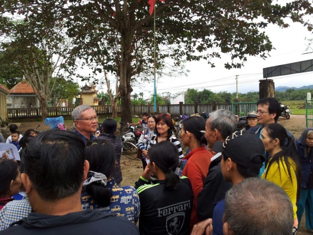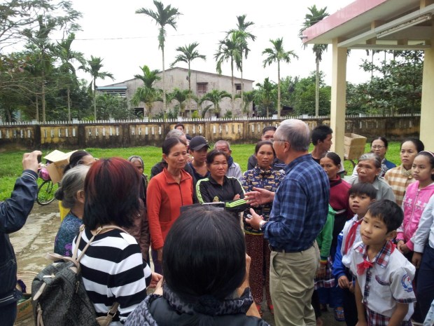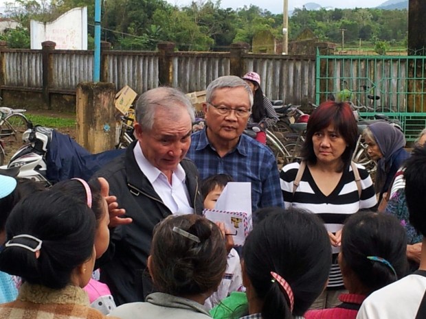 Herr Quỳnh (er ist unser Vertrauter vor Ort, der dem Deutsche-Vietnamesischen-Freundeskreis Aachen im Direkthilfe-Projekt Duy Thu unterstützt) und Frau Huyền, Lehrerin der Grundschule Duy Thu, zusammen mit 2 weiteren Studenten der Hochschule Da Nang als freiwillige Helfer haben bereits Vorbereitungen getroffen. Seit Mittag haben sie die Reissäcke, Nudeln und Geschenke in den Mini-Van beladen. Unsere Gruppe bestand aus Herrn Quỳnh, dem Fahrer und den 2 Studenten, dem Ehepaar Ni-Thành, Frau An (Ehefrau von Herrn Thanh Hải), meiner Frau und mich. Wir verließen Da Nang gegen 13 Uhr und sind ca. 15:30 Uhr in Duy Thu. Dort angekommen sahen wir die strahlenden Gesichter der Kinder, die mit ihren Eltern aufgeregt auf uns warteten.