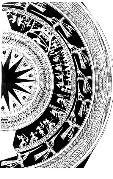 – zwischen dem 5. und 6. Kreis sind zwei breite Pfahlbauten mit nach unten gewölbten Dach dargestellt. Im Haus sitzt ein Mann mit langen Haaren. Vor dem Haus vier hohe Trommeln, eine tanzende und zugleich Flöte spielende Gruppe. Hinter dem Haus sind zwei Menschen beim Reisstampfen zu sehen.