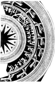 – Zwischen dem 9. und 10. Kreis sind wiederum Vögel, je ein fliegender mit langem Schnabel und ein ruhender mit kurzem Schnabel, dargestellt. Alle Vögel und Tiere sind gegen den Uhrzeigersinn gerichtet.