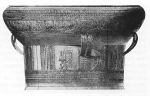 – Die nach außen gewölbte Fläche rund um die Trommel ist auch üppig mit kämpfenden bzw. wetteifernden Szenen dekoriert: Menschen beim Rudern bzw. Leute mit Handwaffen (Lanzen, Bögen, Schwertern), die bei einer Zeremonie tanzen.